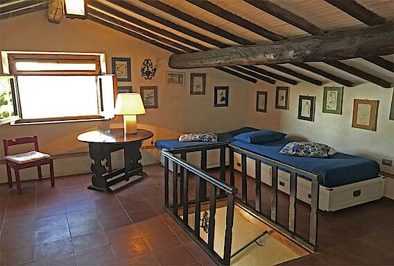 Im oberen Stock gibt es einen großen Raum mit zwei Schlafmöglichkeiten, ein weiteres Schlafzimmer mit Doppelbett und Einzelbett, sowie ein kleines Badezimmer mit Dusche. Der obere Bereich hat außer der Treppe vom Wohnzimmer im Erdgeschoss auch einen eigenen Ausgang zum hinteren höher gelegenem Garten und bietet somit die Möglichkeit die beiden Stockwerke auch getrennt zu bewohnen.