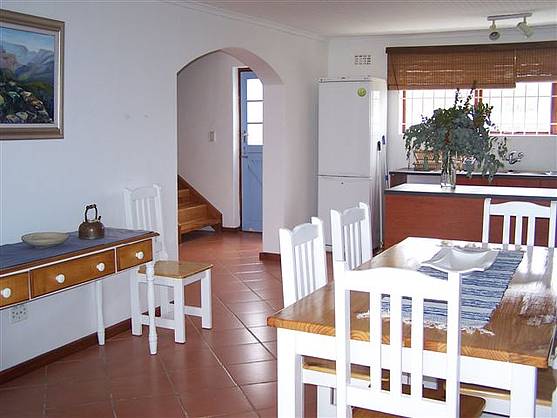 The living room on the first floor is spacious with sea and mountain views. A sliding door leads out to a covered balcony. Next to the living room is a separate TV room, bring your own decoder. The open-plan kitchen is neat and fully equipped (inc. dishwasher). The dining room has a large table and eight chairs. From the dining room you can walk through the sliding door to the built-in braai/ BBQ under roof. Next to it is an area to sit with teak table and chairs.