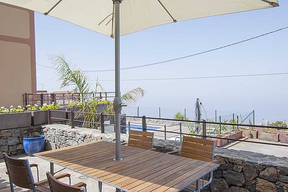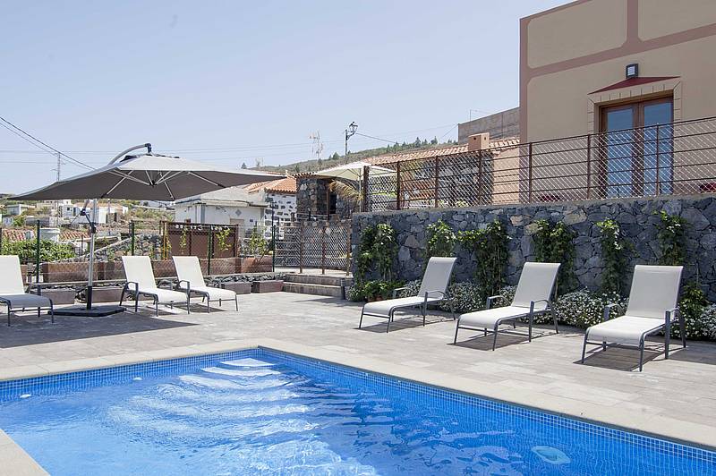 This rural house is composed of a beautiful living room with terrace and nice views over the swimming pool and the islands of la Gomera, El Hierro and La Palma.