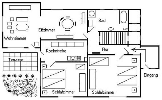 Die großzügig geschnittene Ferienwohnung verfügt über eine Fläche von ca. 100 qm und ist für 2 bis 5 Personen geeignet, denen zwei Schlafzimmer sowie ein Wohnzimmer mit angeschlossenem Eßbereich und eine voll ausgestattete Küche und ein Bad zur Verfügung stehen.