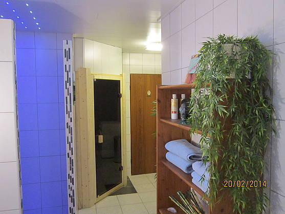 Das modern ausgestattete ca. 13 qm große Badezimmer hat eine barrierefreie Dusche mit blau-weißen LEDs, einen Sonnenhimmel und eine Sauna. Das WC ist in einem separaten Raum. Eine Waschmaschine ist ebenfalls vorhanden.
