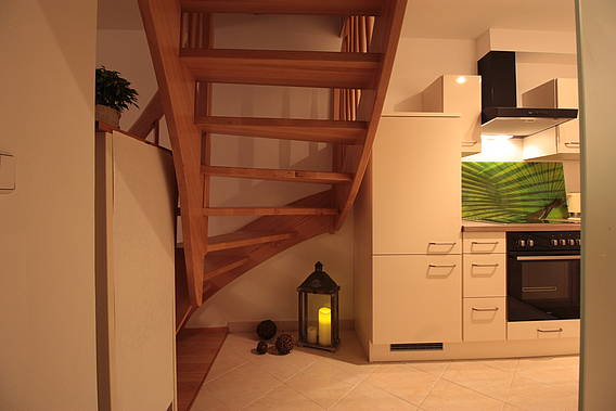 Das Erdgeschoss umfasst eine komplett ausgestattete Küche, Bad mit Dusche, Waschmaschine und zusätzlicher Heizung, ein Wohnzimmer mit Couch, Essecke, TV, Radio/CD und einem Pelletofen mit dem Sie individuell das Haus beheizen können.