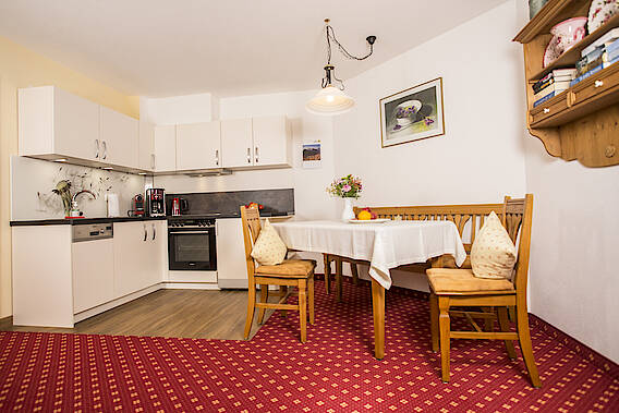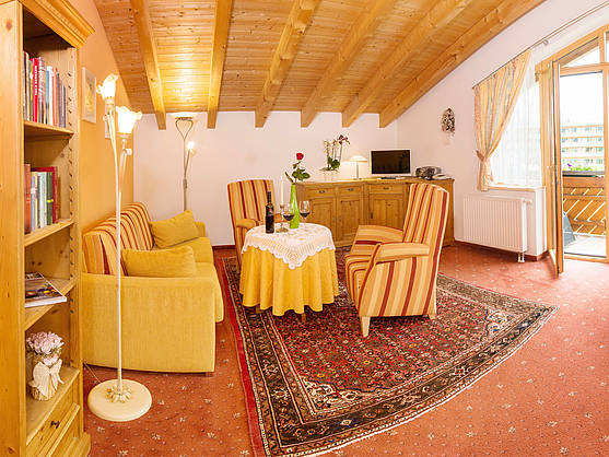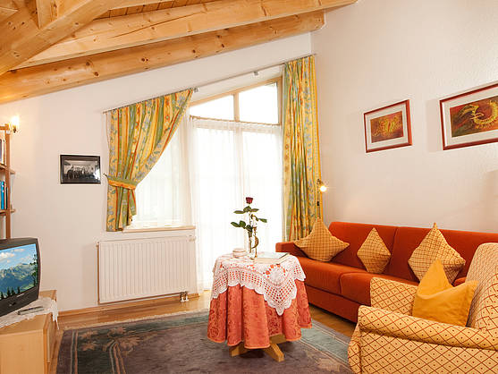 The apartments are furnished in a warm, high quality country house style. 60m2, bedroom, living room with sofa bed for two more persons, cosy dining corner with a kitchenette, bath and separate WC, hall. We also have apartments with separate kitchen, balcony or terrace. Awarded with 4 Edelweiss. Sat TV, Radio-CD player, telephone, Internet with modem available on request. Hair dryer. You can give yourself a feel-well treat in our Turkish Bath every day. Sauna-towels and cuddly bathrobes provided. Bread rolls service. Parking space; garage available on request for a set fee.