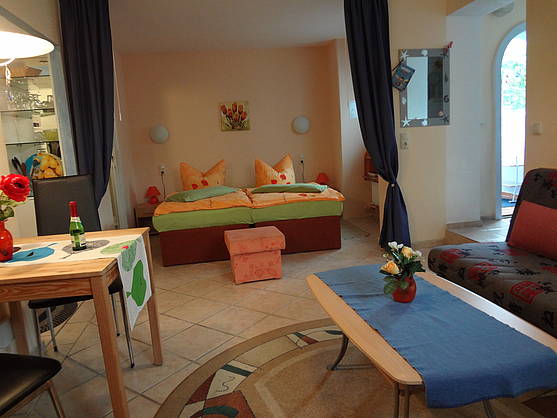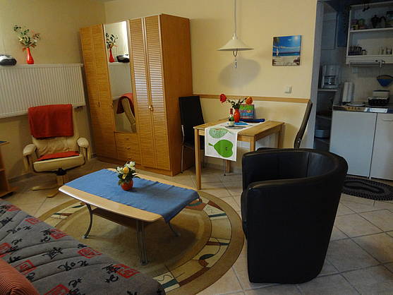Das Appartement ist hell und freundlich eingerichtet. Auf etwa 40 m² bietet das 1-Raum-Appartement in seinem kombinierten Schlaf- und Wohnbereich Platz für bis zu 3 Personen. Für Ihren kurzen oder längeren Ostseeaufenthalt ist unser Ferien-Appartements mit einem Doppelbett und einer Sitzecke, die als Schlafsofa zur Aufbettung genutzt werden kann, ausgestattet. Zusätzlich beinhaltet unser strandnahes Appartements eine kleine, offene Pantry-Küche mit u.a. Kühlschrank, Mikrowelle, Toaster, Wasserkocher, Kaffemaschine und Eierkocher. Und auch für Sat -TV, Radio, Internetanschluss und WLAN ist gesorgt. Dusche und WC befinden sich im separierten Bereich. Preis pro Tag für 2 Personen für Bettwäsche, Handtücher, Strom, Wasser, Heizung. Parkplatz & Fahrräder sind kostenfrei !