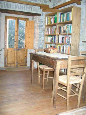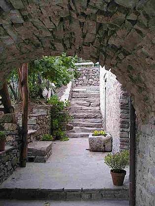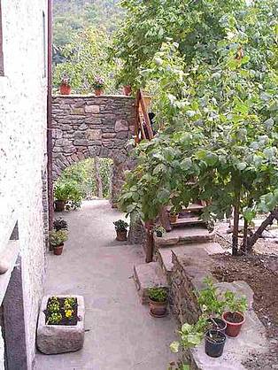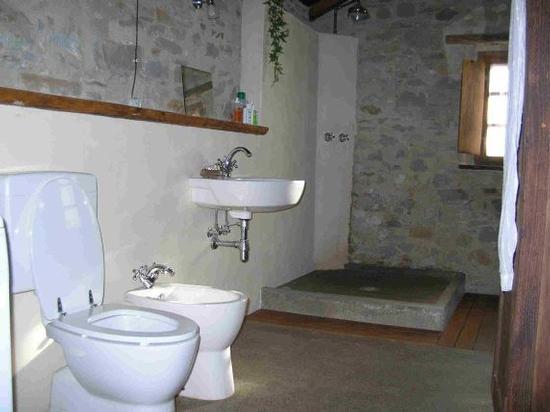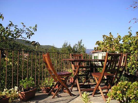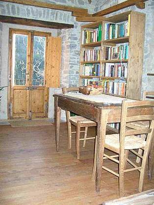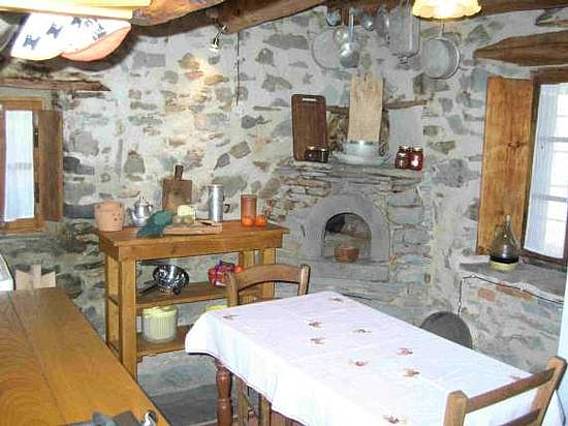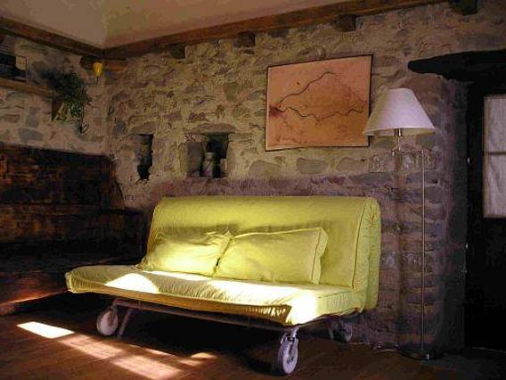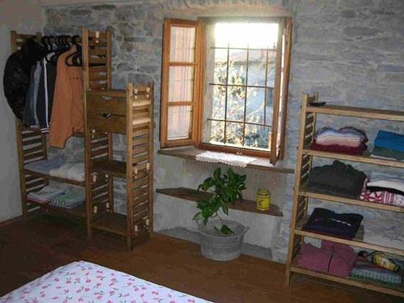 La Bedina is an old ancient house made with sandstone and with a stony roof covered with piagne, sandstone sheets, laid on a plank surface. In front of the house is the beatiful aia, a large space paved with it original flagstones, and a well. The upper level was the old living area of the house, the lower floor originally consisted of three cellars, two of which were once used as stables, the third being a wine cellar. The part of the house available to guests is the upper level which consists of four rooms: the kitchen, the bedroom, the large living room and the bathroom, a total area of around 60 square meters. The entrance to the house is via the kitchen which was once the old gradile, the local name for a chestnut drying room.he kitchen now is a small but lovely and well organized room. The cooking area consists of the cooking plate hosted in a chestnut BANCONE which has shelves for pots and food and where the electric oven finds its place. The washing sink is a two-vasche ceramic sink that was found in an old "bottegha" (old shop of an artigiano) of Florence of an old plumber with the passion of collection old materials. In the kitchen there is also the dining table, but you have the options of having your meals in the spacious living room or in the terrace where you can enjoy also the beautiful view, the songs of birds and the sound of the Magra River. The kitchen is well equipped. When we bought the house, the bedroom was full of cages for rabbits and other domestic animals and it was used as a chicken coop. Today this room has two walls of exposed stonework, a wall of canniccio, and a vaulted ceiling. Both the wall of canniccio and the vaulted ceiling are constructed in the traditional manner which consists of a frame of chestnut wood supporting woven sticks of hazel covered in plaster. The living room is a large environment divided into two areas: the living area with a dining table and its original corner cupboard, and the sleeping area with a sofa bed and large high backed bench. The centrally placed wood burning stove heats the room during the cold months, whilst the two windows and French doors which face south fill the room with light. This room has all four walls in exposed stonework and in one of the two niches you can still see the old clay urn in which money and precious objects would have been hidden. This niche would have been covered with a stone slab and plastered over so that it wasn’t visible, in other words this was the ancient version of the modern wall safe. The living room is a spacious and sunny room where you can enjoy you meals, or you can relax reading a book, listening to a nice cd, or watching a good movie. Available to guests are a collection of Italian and English books, cd, satellite TV and radio, the stereo and the DVD reader. The window doors in the living room lead out onto the terrazza, a large balcony paved with sandstone slabs, from which you have a wonderful view of the valley below and of the village of Casalina. In the terrace you can find a dining table and umbrellas and it is a perfect place to have you breakfast or your dinners with grilled meat or fished prepared with the barbecue available in the portico, which can be used also to cook bread, pizzas and cakes. Steps lead down from the terrazza to the arches below with their imposing stone pillars, to the old stables and cantina, and to the vineyard. The vineyard, which is presently being restored, is around 1000 square meters in size and produces a large quantity of good wine. On the land below the vineyard an organic vegetable garden is being created. From the living room you pass through into the bathroom which was once used as a storage area for food like flour or potatoes. We found a couple of large wooden chests here which had been used for that purpose. The bathroom is characterised by exposed stonework walls, a ceiling of chestnut beams and planks, a built in shower, and the original chestnut doors which we have restored. The large stone doorposts and lintel between the bathroom and the living room show that this was originally a main entrance to the house and that what is now the bathroom was once a large porch that at some point was enclosed with walls to create a room.