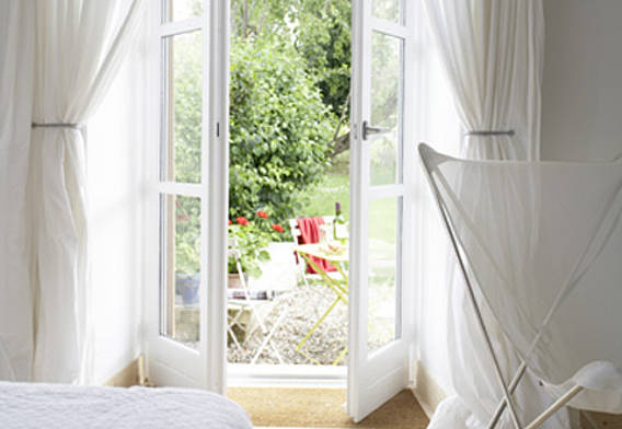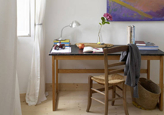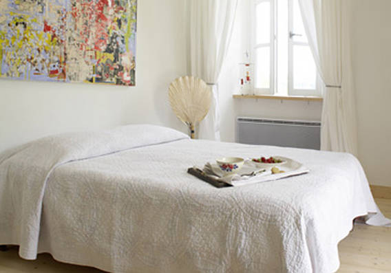 Küche, Eß- und Wohnzimmer bilden eine über 50 m2 große Einheit. Auf zwei Ebenen liegen 3 große Schlafzimmer mit Doppelbetten, zwei Bäder und ein separates WC. La Grange bietet 6 Personen bequem Platz. Die Wohnung besitzt eine geschützte, nach Süden gelegene Loggia und eine 60 m2 große Terrasse mit weitem Blick auf die romanische Kirche und die Burg-Silhouette von Lusignac.