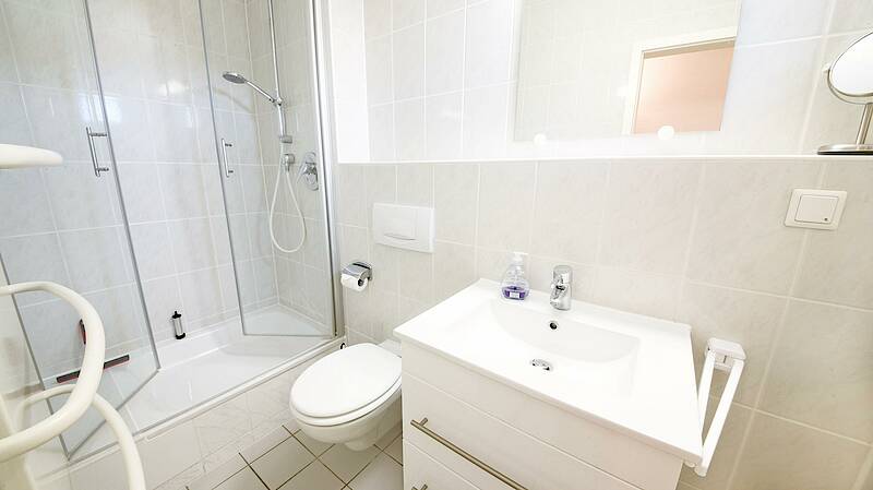 - modernes Bad mit Fenster, Dusche/WC und Handtuchheizkörper
