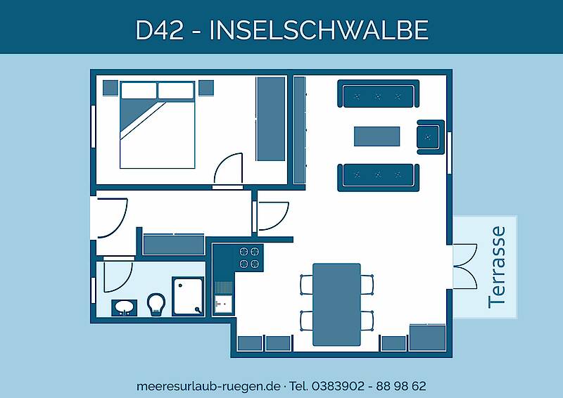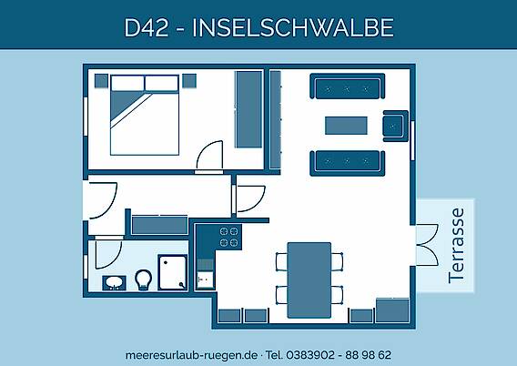 Unsere Inselschwalbe (D42) ist eine ruhig gelegene und geräumige 2-Zimmer-Wohnung mit Terrasse und viel Platz für Ihren Urlaub.