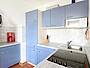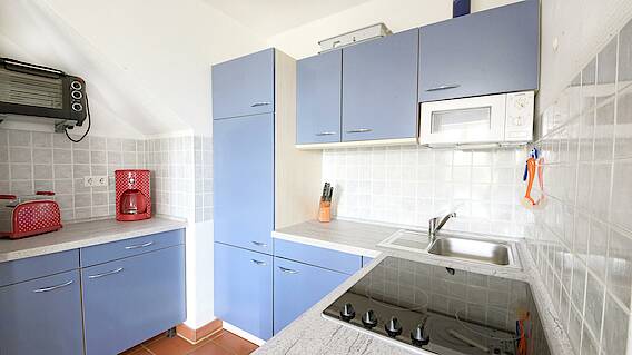 - komplett ausgestattete offene Einbauküche (Toaster, Kaffeemaschine, Wasserkocher, 4-Zonen-Ceranfeld, Backautomat, Geschirrspüler, Kühlschrank mit Gefrierfach, Geschirr und Töpfe) und Esstisch