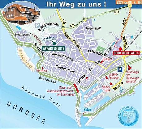 Unser Büro finden Sie wie folgt: Wenn Sie in Büsum angekommen sind, sehen sie links den Aldi-und Neukaufmarkt. Sie fahren die Hauptstraße noch ein Stück bis zur ersten Möglichkeit nach links abzubiegen. Damit haben Sie den Wichelweg gefunden. Unser Büro ist das 4. Gebäude auf der rechten Seite.