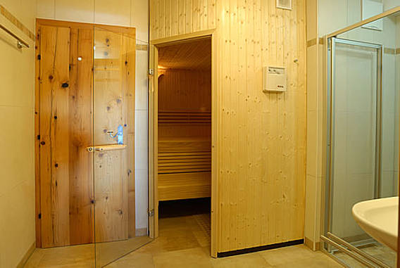 On the large South-West facing balcony, you can lounge around on deck chairs and relax. Relaxation is also guaranteed with the modern Sauna-combination (Finnish, vapour and infrared sauna with WC, shower and loungers) installed outside. Reservations can be made at the reception, which means that the Sauna will be reserved for your private use.
