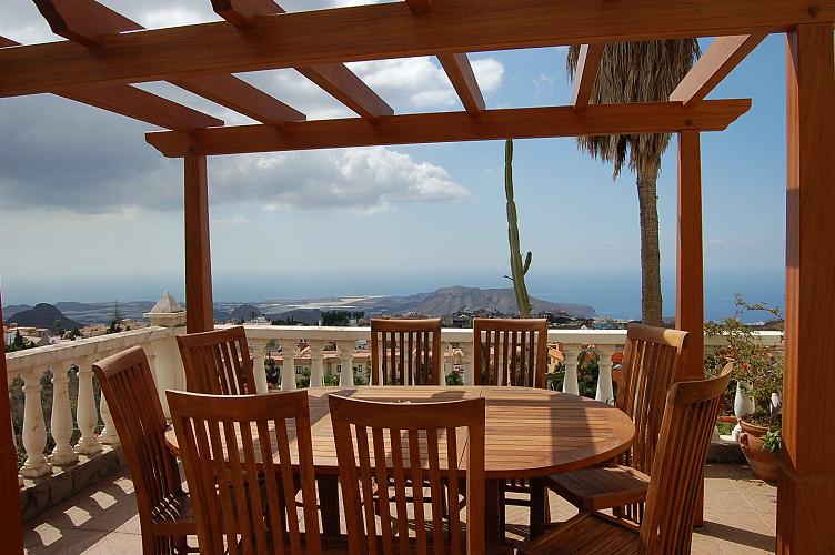 The villa is distributed in two floors. The entrance of the house stands out because its lush vegetation and a beautiful 48 m terrace, with a wooden pergola where guests can enjoy marvellous views, ranging from Arona to the Los Cristianos and Las Americas coasts.