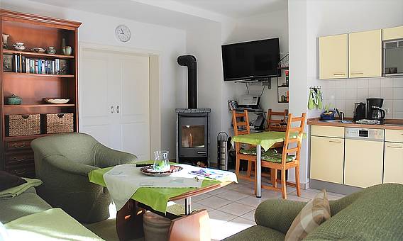 Von der Terrasse gelangen Sie in den Wohnbereich, in dem sich auch die Einbauküche (Komplettausstattung) und der Essbereich offen zum Wohnzimmer mit Kaminofen befindet. Das separate Schlafzimmer mit Doppelbett, Kleiderschrank und das Badezimmer mit Dusche/WC und vielen Annehmlichkeiten (Fön, Kosmetikspiegel, Toilettenpapier uvm.) befindet sich im hinteren Teil der Ferienwohnung. Haustiere sind nicht gestattet.